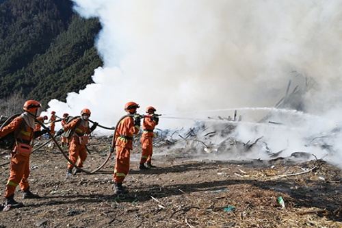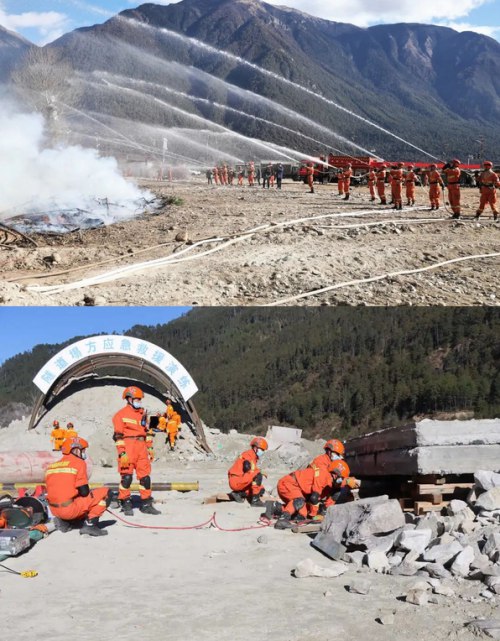 模擬演練背景:12月13日09:50,林芝市巴宜區(qū)覺(jué)木路附近兩座高壓輸電塔因地震導(dǎo)致傾倒,電線(xiàn)短路瞬間引發(fā)了森林火災(zāi),熊熊燃燒的大火在林間蔓延。因地震造成周邊地區(qū)部分房屋倒塌,道路、橋梁損毀,通信和電力中斷,地面救援困難重重。