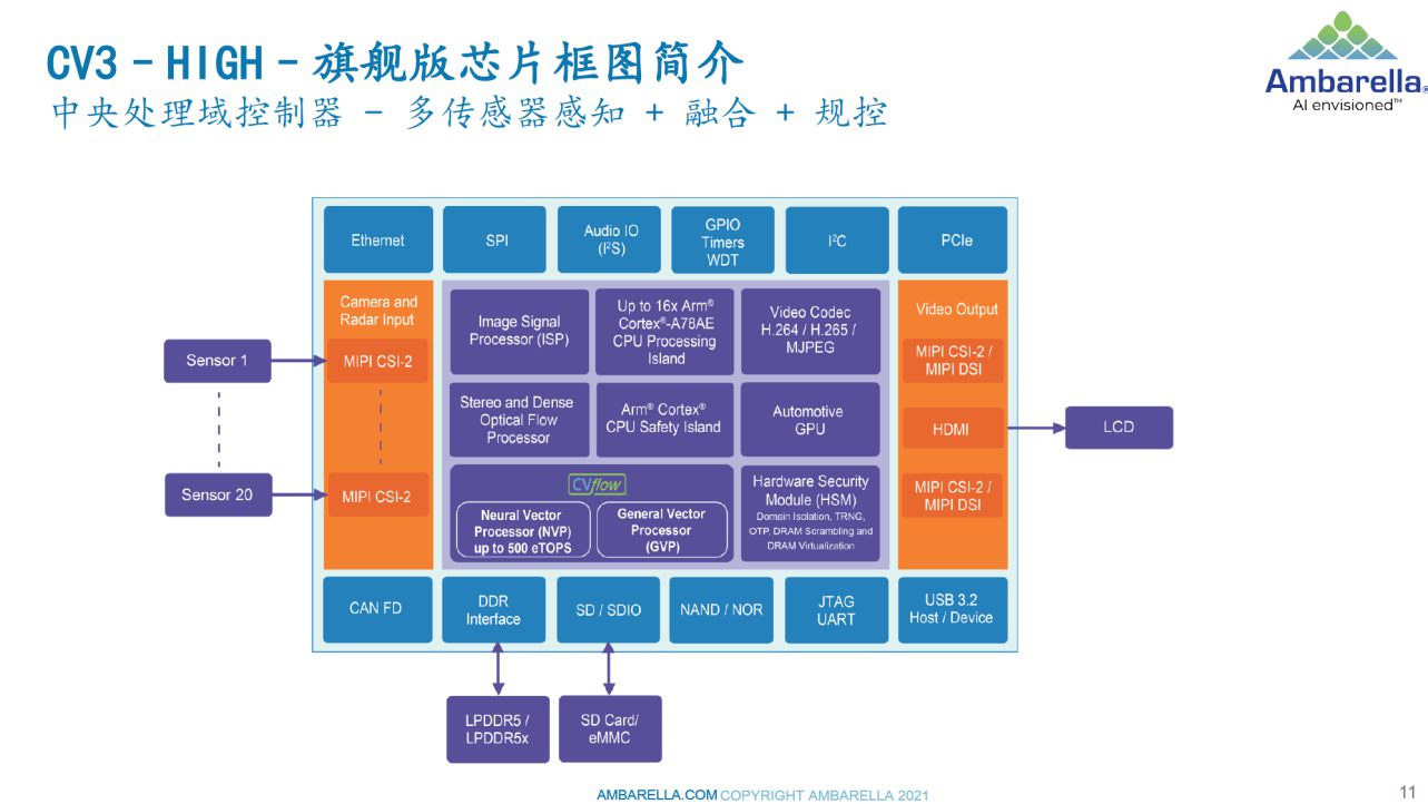新一代的CV3為單芯片域控制器,首發(fā)的型號為最高性能的旗艦版,后續(xù)會在旗艦版的基礎(chǔ)上陸續(xù)推出新的低成本型號。CV3采用了和CV5相同的5nm 低功耗制程,內(nèi)置了16個Arm Cortex-A78AE內(nèi)核,搭載了新一代的CVflow架構(gòu),AI算力高達(dá)500 eTOPS,比CV2 系列提高了42 倍,每瓦性能比提高了4倍。單芯片集成多傳感器進(jìn)行集中化AI 感知處理(包括高像素視覺處理、毫米波雷達(dá)、激光雷達(dá)和超聲波雷達(dá))、多傳感器深度融合以及自動駕駛車的路徑規(guī)劃。