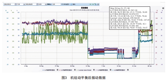 對發(fā)電機(jī)轉(zhuǎn)子進(jìn)行加重后,該機(jī)組5號軸瓦X向振動降低至81.2μm、y向振動降低至95.8μm,6號軸瓦X向振動降低至57.2μm、y向振動降低至62.6μm。如圖3所示,振動數(shù)據(jù)趨于期望值,說明通過對發(fā)電機(jī)轉(zhuǎn)子進(jìn)行現(xiàn)場動平衡,降低了機(jī)組的振動,機(jī)組的振動情況得到良好改善。