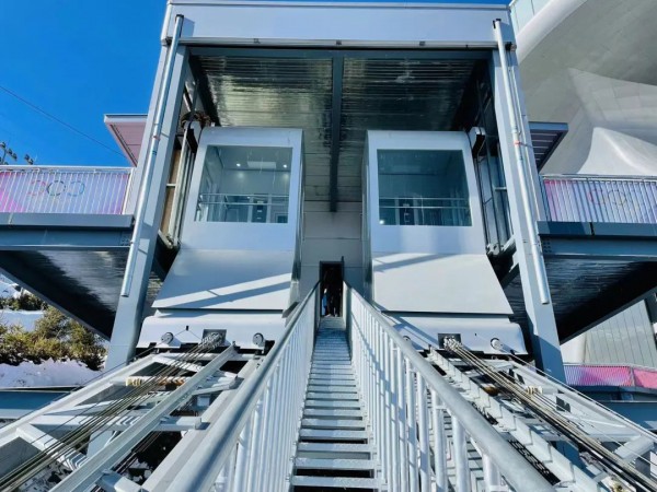 "雪如意"由頂部的頂峰俱樂部、中部大跳臺(tái)、標(biāo)準(zhǔn)跳臺(tái)、裁判塔及底部的看臺(tái)區(qū)組成。項(xiàng)目外側(cè)是超過100米高的帶有弧形軌道的自下而上連接跳臺(tái)底部至頂部的斜行電梯通道,整個(gè)電梯垂直高度達(dá)到了135m,電梯軌道依山體走勢而建,中間有一段弧形軌道,坡度最緩處有22.56度,最陡處高達(dá)39.56度。是國內(nèi)首個(gè)帶有弧形軌道的斜行電梯項(xiàng)目。