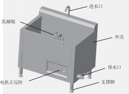 清洗機的結(jié)構(gòu)設(shè)計主要包括清洗機外殼、進水口、排水口、支撐腳、清洗槽內(nèi)部的洗涮銀以及控制電機正反轉(zhuǎn)的按鈕,如圖2所示。