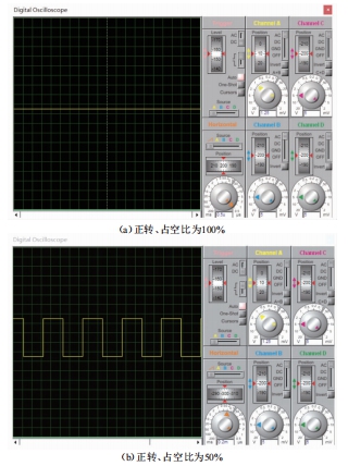 采用PwM調(diào)速方法改變電機兩端電壓的大小,輸出的平均電壓為U=U0t1/(t1t2),其中t1為一個周期內(nèi)高電平所持續(xù)的時間,t2為一個周期內(nèi)低電平所持續(xù)的時間,U0為總電壓,占空比α=t1/(t1+t2)。由上述公式可知,要想實現(xiàn)對直流電機的調(diào)速,可在電源總電壓不變的情況下,改變占空比的大小。