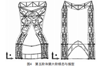 如圖4所示,第五階模態(tài)和第六階模態(tài)固有頻率與固有振型反映了岸邊吊機(jī)主梁和主梁平聯(lián)的水平方向?qū)ΨQ彎曲擺動(dòng)。第五階模態(tài)反映主梁水平方向?qū)ΨQ彎曲振動(dòng),頻率為0.2556Hz:第六階模態(tài)反映的是主梁平聯(lián)水平對(duì)稱彎曲振動(dòng),頻率為0.2834Hz。