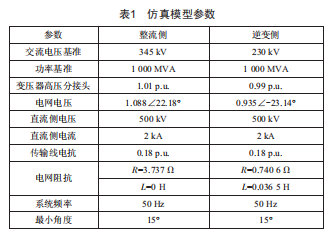 給定系統(tǒng)參數(shù),如表1所示。經(jīng)過計算,整流側(cè)參數(shù):標幺值系統(tǒng)中電壓基值vB為345kV,電流基值IB為1.67kA,阻抗基值ZB為207Ω,系統(tǒng)線路電感值L為0.12H。逆變側(cè)參數(shù):標幺值系統(tǒng)中電壓基值vB為230kV,電流基值IB為2.51kA,阻抗基值ZB為97Ω,系統(tǒng)線路電感值L為0.05H。