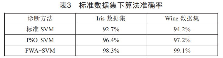 為了進(jìn)一步證明本文算法的有效性和準(zhǔn)確性,選擇機(jī)器學(xué)習(xí)中常用的標(biāo)準(zhǔn)數(shù)據(jù)集中的wine數(shù)據(jù)集和Iris數(shù)據(jù)集對本文算法進(jìn)行驗(yàn)證,結(jié)果如表3所示。結(jié)果表明,本文算法同樣適用于其他數(shù)據(jù)集分類,證明了算法的泛化性。