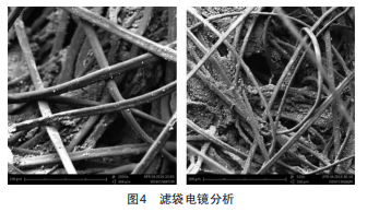 電區(qū)除塵效率降低 , 必將造成布袋區(qū)除塵負(fù)荷的增加 ,具有強(qiáng)黏性的粉塵大量附著在濾袋上 ,造成清灰困難 , 這是運(yùn)行阻力大幅上升的直接原因。長(zhǎng)期清灰困難將使黏 性粉塵滲入濾袋內(nèi)部 ,造成濾袋不可逆堵塞。濾袋堵塞 , 引起過(guò)濾風(fēng)速增大 ,超出設(shè)計(jì)允許值 ,可能造成破袋 ,使濾袋失效 ,排放超標(biāo)。圖4所示為對(duì)該電袋復(fù)合除塵器濾袋的電鏡分析 ,可見(jiàn)其纖維層中存在大量板結(jié)粉塵。