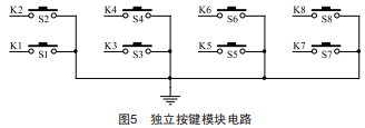 本設計主要使用2×4獨立按鍵的K1、K2、K3和K4四個按鍵,K1、K2、K3和K4分別連接單片機的P44、P45、P46和P47口,GND與單片機共地,每個按鍵單獨占用一個單獨GPIO口,不會影響其他GPIO口狀態(tài)。獨立按鍵模塊電路原理圖如圖5所示,該電路配置靈活,軟件結構簡單。