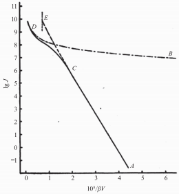 注:ACE為F-N理論曲線:BD為Child理論曲線:ACD為空間電荷修正曲線。