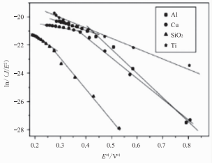 他們測量了在不同材料(Cu、Al、Ti、sio2)上沉積的CNT場發(fā)射特性,從圖2可以看出,不同材料做襯底基板時CNT場發(fā)射特性是不同的,Ti基板上的CNT具有最佳的場發(fā)射特性,在適當(dāng)?shù)碾妶鱿驴梢赃_到很高的電流密度,說明CNT場發(fā)射特性會受其與基板間的接觸電阻的影響。從圖3可以看出,不同基板上CNT的F-N曲線都不是線性的,與理論預(yù)測值有很大的偏差,在電場強度較高的時候,CNT場發(fā)射獲得的電流密度均低于F-N理論預(yù)測值。這些實驗都證明了CNT與基底之間的接觸電阻對碳納米管場發(fā)射是有很大影響的,是引起CNT場發(fā)射電流密度降低的一個可能原因。