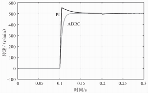 為了驗證該調(diào)速系統(tǒng)對負載擾動的抑制能力,在空載啟動電機后,轉(zhuǎn)速達到500r/min時,在0.2s時刻分別給電機ADRC調(diào)速系統(tǒng)和PID調(diào)速系統(tǒng)突加5N·m的負載擾動,如圖3所示,在PI控制策略下,轉(zhuǎn)速的跌落幅度達10r/min,而在ADRC調(diào)速系統(tǒng)中,轉(zhuǎn)速的跌落幅度僅有4r/min,且在0.02s后系統(tǒng)恢復穩(wěn)定狀態(tài)。因此采用ADRC控制策略使得系統(tǒng)具有更好的穩(wěn)定性,對負載擾動具有更好的抑制效果。