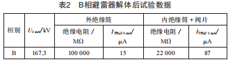 (2)將避雷器分解成外絕緣筒和內(nèi)絕緣筒兩部分,其中氧化鋅閥片包裹在內(nèi)絕緣筒里面。解體后觀察外絕緣筒與上密封蓋的密封性能良好,內(nèi)絕緣筒外壁和外絕緣筒內(nèi)壁無受潮現(xiàn)象和放電點,上密封蓋附近金屬部位光亮無氧化痕跡。對兩部分進行試驗,發(fā)現(xiàn)外絕緣筒絕緣電阻和泄漏電流均無問題,但內(nèi)絕緣筒+閥片部分的泄漏電流過大,達到87μA,超過50μA的試驗標準。之后對內(nèi)絕緣筒進行解體,B相避雷器解體后試驗數(shù)據(jù)如表2所示。
