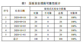 對(duì)某變電站進(jìn)行現(xiàn)場(chǎng)檢查,結(jié)果如表1所示,使用該壓板防誤閉鎖裝置布置的安全措施在100個(gè)樣本中的可靠性為100%。相較于采用傳統(tǒng)的絕緣膠布布置方式,新裝置從易受灰塵、溫度和油污等外部環(huán)境影響的粘貼原理,變?yōu)榭煽壳也皇墉h(huán)境影響的機(jī)械限位鎖定原理,從根本上杜絕了安全措施脫落、移位等不可靠現(xiàn)象的產(chǎn)生,達(dá)到了100%的可靠性。