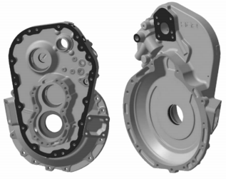如圖1所示,AE300發(fā)動機齒輪箱主要可以分成兩個部分:齒輪箱殼體和齒輪箱蓋板。齒輪箱殼體與發(fā)動機通過離合片相連。齒輪箱殼體內裝配有與離合片相連的輸入軸齒輪、中間過渡的中間軸齒輪、螺旋獎軸軸承、調速器齒輪軸軸承以及完整的潤滑系統(tǒng)。潤滑系統(tǒng)的核心是滑油泵、驅動齒輪、油濾和油路。潤滑油被滑油泵由吸油管從齒輪箱底部吸上來,通過齒輪泵后增壓輸入到殼體中的滑油路供給各個運動部件,比如各個軸承。齒輪齒面的潤滑是通過輸入軸齒輪旋轉時將浸沒齒輪的潤滑油甩起來潑濺到與之連接的齒輪上,再通過齒輪間的接觸、轉動潤滑到各個齒面。齒輪箱殼體上還有安全活門、放油磁性堵頭、通氣管、溫度傳感器等零部件,還可以外接散熱器、調速器。齒輪箱蓋內裝配有螺旋獎軸和齒輪、調速器驅動軸軸承和齒輪。把齒輪箱殼體和齒輪箱蓋合在一起后,螺旋獎軸齒輪可以帶動滑油泵齒輪運轉工作。