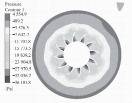 圖9是葉片縱截面壓力分布云圖,受葉片旋轉(zhuǎn)的影響,在葉輪區(qū)域,壓力相對較低,蝸殼區(qū)域由于氣流速度的增加,壓力增大。