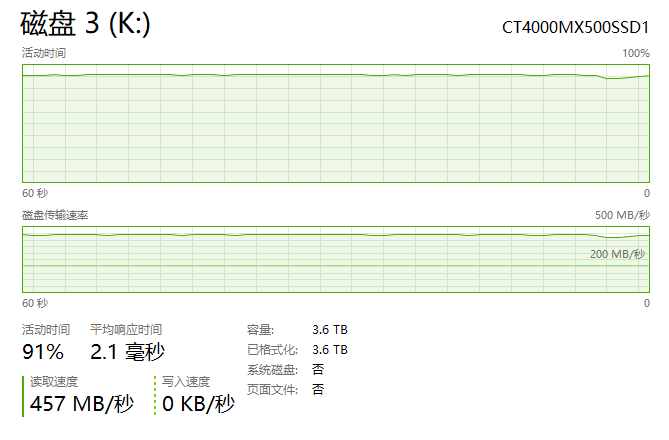 對硬盤進(jìn)行實際讀取測試,也沒有出現(xiàn)掉速情況,能穩(wěn)定在457MB/s左右。