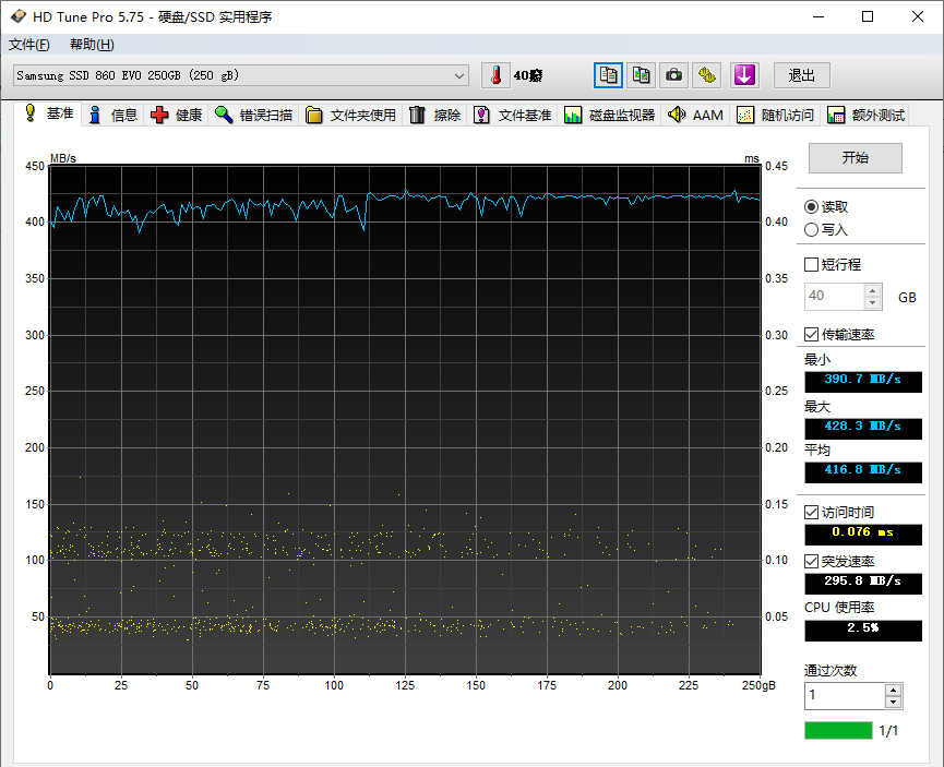 使用HD Tune進(jìn)行基準(zhǔn)讀取測試,MX500的讀取速率略低于三星860 EVO。