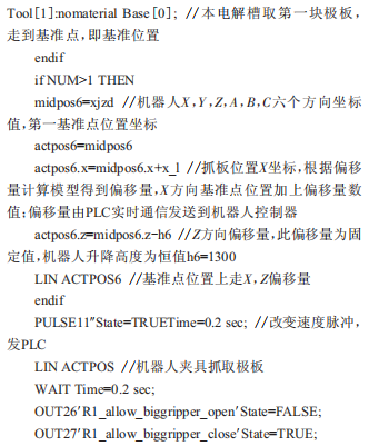 機(jī)器人夾具從電解槽內(nèi)抓取極板時(shí),其程序根據(jù)計(jì)算所得偏移量y=?(a+b+d)mm執(zhí)行,得到了很好的不工整極板位置定位,能夠順利抓取極板,完成生產(chǎn)。程序執(zhí)行過(guò)程詳見程序及注釋如下: