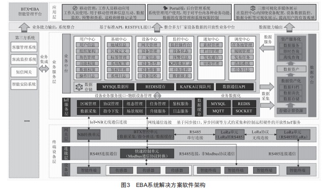 EBA智能管理平臺(tái)即由基于云端應(yīng)用的EBA管理系統(tǒng)、EBA邊緣服務(wù)器、IoT智控單元、邊緣控制器、LoRa轉(zhuǎn)換單元、NB轉(zhuǎn)換單元、Cat.1轉(zhuǎn)換單元、智能水電表和智能動(dòng)態(tài)環(huán)境參數(shù)監(jiān)測傳感器等構(gòu)建的軟硬件一體化的智能化管理平臺(tái)。圖3為EBA應(yīng)用解決方案整個(gè)軟件開發(fā)架構(gòu)示意圖。