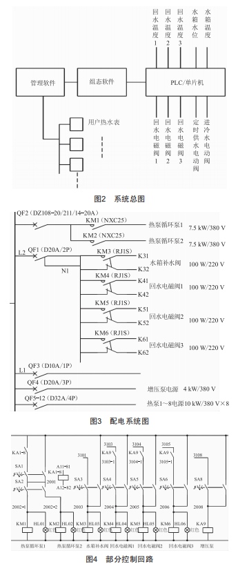 熱水控制系統(tǒng)由管理軟件、組態(tài)軟件、PLC(也可使用單片機)、熱水表、傳感器、繼電器、接觸器等組成??刂葡到y(tǒng)總圖如圖2所示,配電系統(tǒng)圖如圖3所示,部分控制回路如圖4所示。