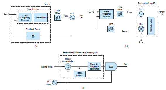 圖1.(a) PLL、(b) 轉(zhuǎn)換環(huán)路、(c) DDS的簡(jiǎn)化框圖