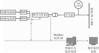 這套工作系統(tǒng)是將儲(chǔ)能電池組之間通過(guò)銅排進(jìn)行連接,直流配電柜至PCS采用電纜經(jīng)由電纜溝接入PCS直流側(cè)輸入斷路器 ,從而接入市內(nèi)電網(wǎng)。采用Modbus TCP/IP通信方式將工作狀態(tài)反饋給集中監(jiān)控系統(tǒng)和智能后臺(tái)監(jiān)控系統(tǒng),進(jìn)行整個(gè)儲(chǔ)能系統(tǒng)的調(diào)控[4]。