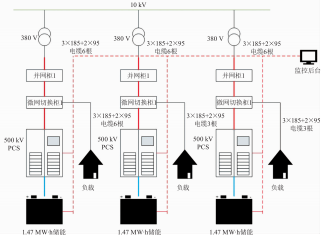 根據(jù)基本情況設(shè)計(jì)并做出模擬圖,如圖3所示,儲(chǔ)能電站自并網(wǎng)柜新建三回電纜線路將接入用戶廠區(qū)2#變電所380 v母線上網(wǎng) ,2#、4#、5#變壓器低壓側(cè)各接入500kvA ,單回路最大電流l000A,同時(shí)考慮每回線路同時(shí)充電和給用電負(fù)荷供電,按l000kvA容量計(jì)算,新建電纜型號(hào)為6×(ZRC-yJV-3 × 185+2×95)。采用無(wú)線公網(wǎng)通信方式,并向電網(wǎng)調(diào)度機(jī)構(gòu)提供并網(wǎng)點(diǎn)電流、電壓、并網(wǎng)點(diǎn)開關(guān)狀態(tài)和發(fā)電量信息:儲(chǔ)能電站功率因數(shù)控制在0.95(超前)~0.95(滯后)且連續(xù)可調(diào)。