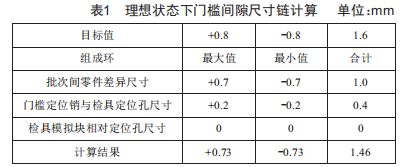 通過線性尺寸鏈的介紹分析,可以判斷門檻在總成檢具上的尺寸鏈中各環(huán)的組成分別是門檻、檢具定位孔以及后門模擬塊。首先,通過批量測量可以得出相同生產(chǎn)批次、相同工藝的門檻零件之間的尺寸波動范圍約±0.7mm,門檻定位銷與定位孔存在裝配偏移,偏移公差±0.2mm,后門模擬塊相對檢具定位孔尺寸偏差為0。經(jīng)計算發(fā)現(xiàn)目標(biāo)間隙的公差范圍僅±0.73mm,如表1所示,滿足給定的公差范圍。但是實際測量波動范圍遠(yuǎn)超公差范圍,可以推斷測量過程中的變量并未完全考慮到尺寸鏈中。