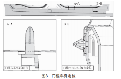 采用RPS定位法對相關(guān)零件進行定位,保證在同一基準(zhǔn)定位系統(tǒng)下測量分析。門檻與模擬車身檢具的安裝定位方案嚴(yán)格遵守"3·2·1"定位進行設(shè)計。該車型門檻與車身飯金的定位結(jié)構(gòu)如圖3所示。門檻通過中間定位銷與飯金孔實現(xiàn)X向定位,其他定位銷對應(yīng)的飯金腰形孔則為Z向定位,Y向定位通過卡扣與車身飯金拉緊。由此可以看出,門檻與后門匹配間隙主要受產(chǎn)品X向尺寸影響。