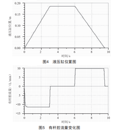 (1)通過(guò)換向閥上的電磁閥信號(hào)控制換向閥工作位置:設(shè)定換向閥0~3u工作在右位時(shí),液壓油從換向閥的P口進(jìn)入A口,油液再同時(shí)從兩個(gè)液控單向閥進(jìn)入液壓缸的左側(cè)無(wú)桿腔和右側(cè)有桿腔,圖5和圖6顯示0~3u時(shí)進(jìn)入無(wú)桿腔的流量大于有桿腔流量,由于液壓缸的速度與流量成正比,得出液壓缸做伸出運(yùn)動(dòng)。