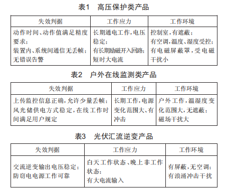 根據(jù)變電站、發(fā)電廠現(xiàn)場(chǎng)運(yùn)行特點(diǎn)對(duì)不同用途的繼電保護(hù)裝置進(jìn)行分析,明確產(chǎn)品的失效判據(jù)、工作應(yīng)力、工作環(huán)境,具體如表1、表2、表3所示。