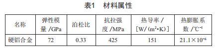 蒙皮的材料選擇硬鋁合金,其材料屬性如表1所示。由于熱導(dǎo)率和熱膨脹系數(shù)都是隨溫度變化而變化的,但在20~150℃內(nèi)其值變化較小,所以表1中的熱導(dǎo)率和熱膨脹系數(shù)均取其平均值。