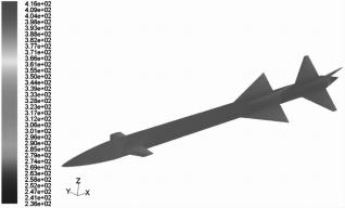 在0。攻角、Ma為1.5的飛行狀態(tài)下,設(shè)置靶機表面為絕熱條件,使用穩(wěn)態(tài)流場CFD計算,得到靶機的表面溫度分布云圖,如圖4所示。從圖中可以看到,靶機表面溫度最高為416K,即143℃,平均溫度在140℃左右。