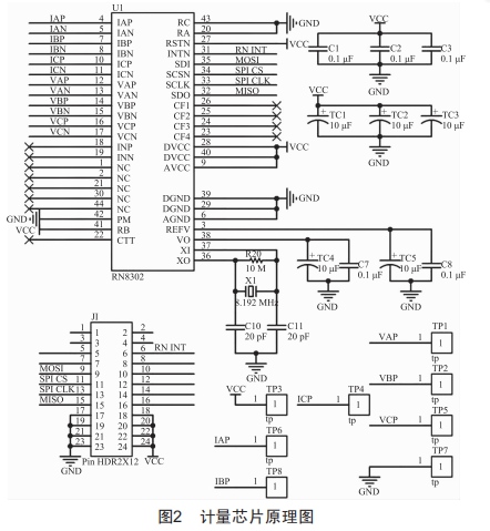 多功能電能表硬件上采用ARM處理器作為主控制器,采用電量計(jì)量芯片處理計(jì)算電參數(shù)。主控制器型號(hào)為GD32F303RCT6,該處理器具有32位高性能精簡(jiǎn)指令集CPU,處理能力高達(dá)250MIPs,自帶單周期的DsP指令,GD32F303RCT6片上F1ash為256kb,RAM為48kb,具有豐富的外設(shè)資源,多達(dá)3個(gè)UsART+2個(gè)UART,3路sPI,2路sDIO,2路CAN總線,16通道ADC。電量計(jì)量芯片型號(hào)為RN8302B,該芯片帶有7路ADC通道,實(shí)現(xiàn)三相電壓、電流及零線電流的采集。除了常規(guī)的電能脈沖校表法外,RN8302B芯片還支持功率校表法。