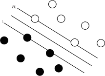 對(duì)于群體在線性可分情況下的分類(lèi)情況示意如圖1所示,由圖可知,兩類(lèi)不同的樣本被分類(lèi)線H分離,且存在兩條與H平行的直線H1和H2分別經(jīng)過(guò)了兩組樣本最靠近分類(lèi)線的樣本。針對(duì)此結(jié)果,可得出最優(yōu)分類(lèi)線的定義:針對(duì)兩樣本存在一條分類(lèi)線能將其正確分類(lèi),而且H1和H2的距離最大。