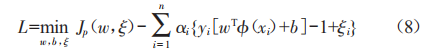 為了實(shí)現(xiàn)對(duì)最優(yōu)分類(lèi)面的求解,通常引用拉格朗日優(yōu)化方法,利用該方法將此問(wèn)題轉(zhuǎn)化為對(duì)偶問(wèn)題,可得: