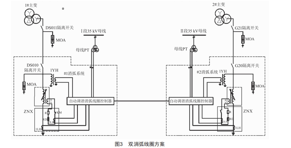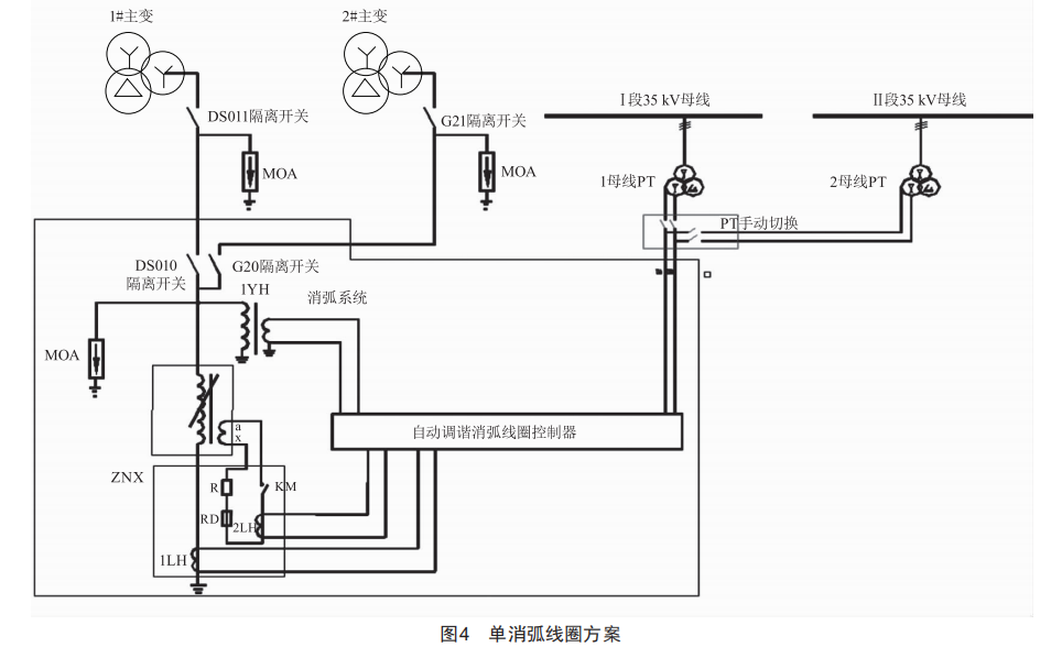 根據(jù)上述分析結(jié)果及勝利110kV變電站的實(shí)際情況,35kV系統(tǒng)需采用中性點(diǎn)諧振接地方式,即消弧線圈接地方式,實(shí)現(xiàn)對(duì)系統(tǒng)對(duì)地電容電流的補(bǔ)償,也可以在I段母線上增加消弧線圈。方案如圖3和圖4所示。
