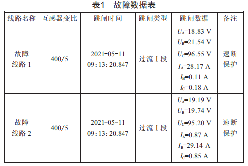 202C年5月,勝利CC0kV變電站2回35kV線路同時(shí)故障跳閘,經(jīng)檢查發(fā)現(xiàn)一回35kV線路1相避雷器擊穿,另一回線路全線檢查未發(fā)現(xiàn)故障點(diǎn),如表1所示。