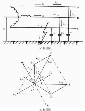 各相對(duì)地電容電流的數(shù)值相等,相位相差120。,它們的相量和等于零,如圖1(b)所示,地中沒(méi)有電容電流通過(guò),中性點(diǎn)對(duì)地電位與地電位一致,此時(shí)中性點(diǎn)是否接地對(duì)各相對(duì)地電壓沒(méi)有任何影響。