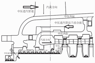 主要檢查部位(圖1):(1)中壓進(jìn)汽管、密封環(huán);(2)中壓進(jìn)汽管法蘭結(jié)合面;(3)中壓內(nèi)缸水平中分面間隙;(4)中壓前內(nèi)汽封性能情況。