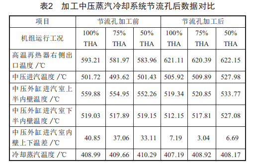 加工中壓蒸汽冷卻管路所屬節(jié)流孔板后,可將再熱蒸 汽溫度提高至620 ℃ ,在典型工況下汽缸上下溫差在3~8 ℃ , 較未加工節(jié)流孔溫差下降30~40℃,效果較為明顯,具體運(yùn)行參數(shù)如表2所示。