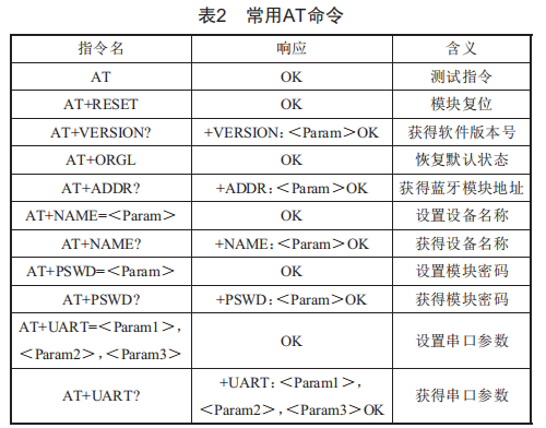 (3)當(dāng)藍(lán)牙模塊的工作方式是接收指令工作模式時(shí),能執(zhí)行AT命令,用戶可通過串口調(diào)試助手向模塊發(fā)送各種AT指令,為模塊設(shè)定控制參數(shù)或發(fā)布控制命令。HC-05藍(lán)牙應(yīng)用模塊常用的AT指令詳細(xì)介紹如表2所示。