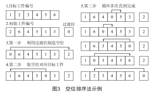 為了解決經(jīng)典排序算法操作過程太費時費力的問題,本文使用了空位排序法,即排序過程中一直關(guān)注空位(如果當(dāng)前倉庫沒有空位,則利用過渡位先制造一個空位),查找當(dāng)前空位的目標(biāo)工件編號所在的工位號,從中取出工件,從而創(chuàng)建出一個新的空位,再循環(huán)查空位和取空位目標(biāo)工件多次,直到完成排序。圖3為空位排序法的一個示例。