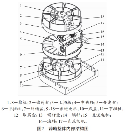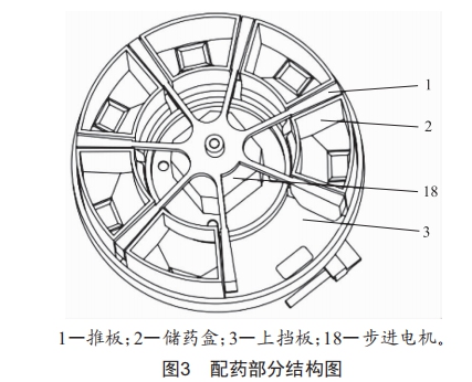 該部分結(jié)構(gòu)主要由推板l、儲(chǔ)藥盒2、上擋板3和步進(jìn)電機(jī)l8組成,如圖3所示。步進(jìn)電機(jī)l8放置在上擋板3中心,推板l與步進(jìn)電機(jī)l8連接在一起,儲(chǔ)藥盒2放置在上擋板上,相鄰兩個(gè)儲(chǔ)藥盒通過(guò)推板l分隔。工作時(shí),按照設(shè)定好的要求,步進(jìn)電機(jī)l8帶動(dòng)推板l轉(zhuǎn)動(dòng)設(shè)定好的角度,儲(chǔ)藥盒2轉(zhuǎn)動(dòng)到出藥口,待出藥完成之后再?gòu)?fù)位。且出藥時(shí)第一個(gè)出藥口處由直流電機(jī)l7帶動(dòng)滾軸l6上緊密接觸的海綿柱體向相反方向轉(zhuǎn)動(dòng),以保證順暢出藥。藥品由海綿柱體轉(zhuǎn)運(yùn)經(jīng)過(guò)出口后還會(huì)經(jīng)過(guò)一對(duì)紅外對(duì)射管以檢測(cè)出藥數(shù)量,當(dāng)檢測(cè)到出藥量等于用戶(hù)輸入所需服藥量時(shí),直流電機(jī)l7先停止轉(zhuǎn)動(dòng),然后反向轉(zhuǎn)幾圈,把進(jìn)入緊密接觸的海綿柱體通道的藥粒送回儲(chǔ)藥盒。