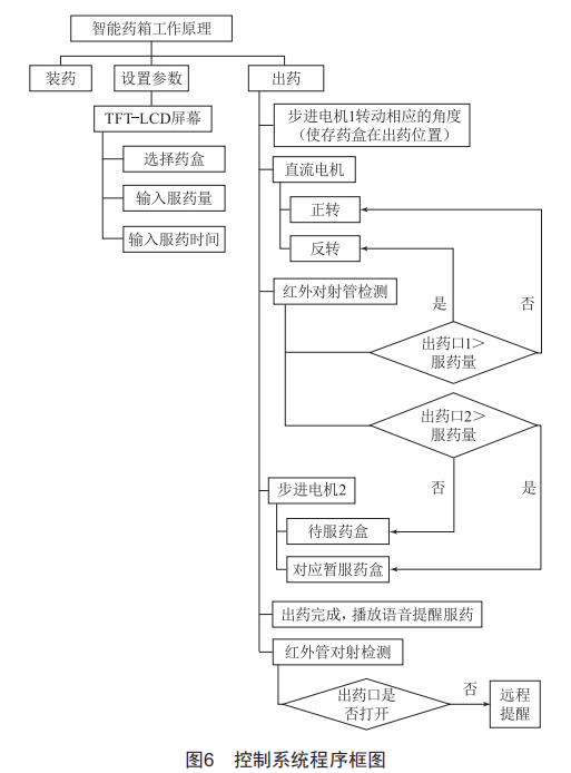 本藥箱的控制系統(tǒng)采用sTM32F407核心板,使用C語(yǔ)言進(jìn)行編程,并配置TFT-LCD屏幕以設(shè)置服藥時(shí)間和服藥數(shù)量,其程序框圖如圖6所示。系統(tǒng)開(kāi)始工作后,會(huì)先進(jìn)行初始化,若用戶(hù)選擇進(jìn)行配藥,則TFT-LCD屏將顯示字樣以提醒用戶(hù)將藥放入藥盒,用戶(hù)在設(shè)置好吃藥時(shí)間與吃藥數(shù)量后,系統(tǒng)將休眠,當(dāng)?shù)竭_(dá)規(guī)定配藥時(shí)間后,藥箱會(huì)按照預(yù)先設(shè)置進(jìn)行藥物的自動(dòng)配送,幫助老人完成吃藥。