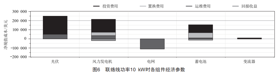 該條件下的風(fēng)/光/儲(chǔ)等組件最優(yōu)配置結(jié)果如表3所示。該配置結(jié)果下,在微電網(wǎng)全壽命周期內(nèi),當(dāng)聯(lián)絡(luò)線功率為10kw時(shí)系統(tǒng)總凈現(xiàn)成本最低為491960美元,電池容量選擇為50×6kw·h。當(dāng)聯(lián)絡(luò)線功率為20kw時(shí),不需要電池儲(chǔ)能,所以本文不再分析討論。各組件經(jīng)濟(jì)參數(shù)分布如圖6所示。