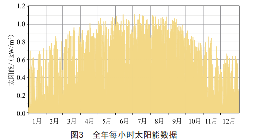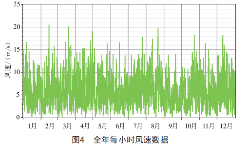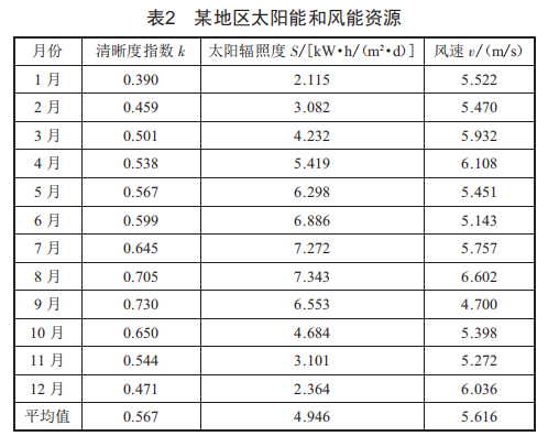 根據(jù)地理位置坐標(biāo),從美國(guó)宇航局(NASA)的相關(guān)網(wǎng)站( HYPERLINK "https://power.larc.nasa.gov/" )上獲取所需歷史氣象資料。某地區(qū)坐標(biāo)為東經(jīng)119●60'、北緯32●30',這里獲取了該地2015一2019年的氣象數(shù)據(jù)并取月平均值。表2所示為按月統(tǒng)計(jì)所得平均太陽(yáng)輻照度s、清晰度指數(shù)k(空氣的清濁程度)以及50m高度風(fēng)速數(shù)據(jù),由統(tǒng)計(jì)結(jié)果可知該地太陽(yáng)能和風(fēng)能資源較為豐富。