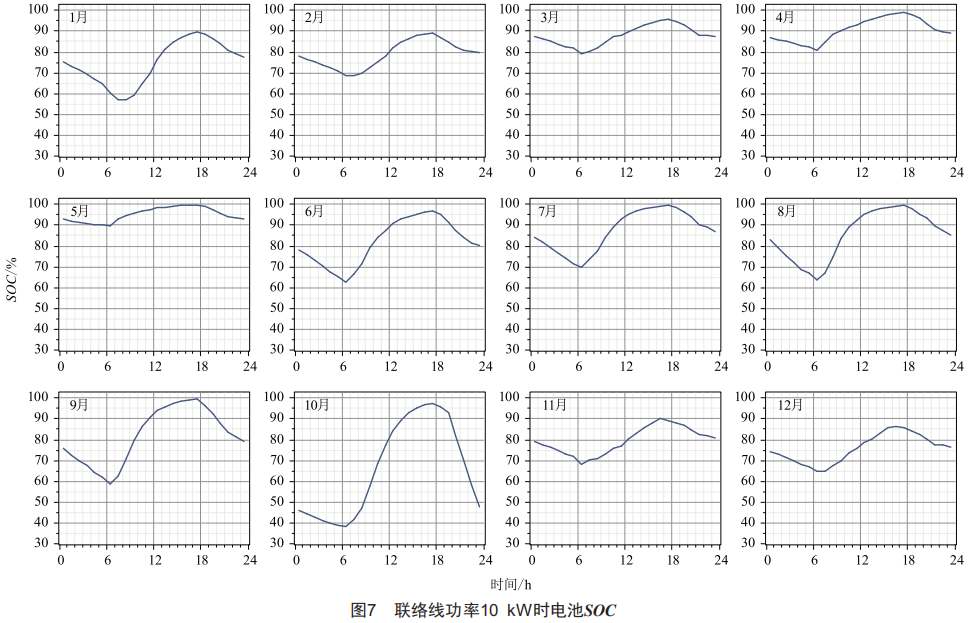 圖7所示為12個(gè)月內(nèi)電池SOC平均每小時(shí)變化曲線,由曲線可知全年電池SOC變化范圍在本仿真模型所選電池SOC限值范圍30%~100%內(nèi),所以可避免出現(xiàn)電池過(guò)充、過(guò)放現(xiàn)象,但SOC處于高限值的時(shí)間段相對(duì)較長(zhǎng)。