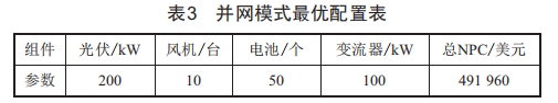 首先,根據(jù)該系統(tǒng)的設(shè)計(jì)方案在H0MER軟件中搭建仿真模型,依次添加光伏電池(PV)、風(fēng)力發(fā)電機(jī)(Generic)、蓄電池(H3000)、交流負(fù)荷(1oad)以及變流器(Converter)。該微電網(wǎng)并網(wǎng)模式下仿真示意圖如圖2所示。