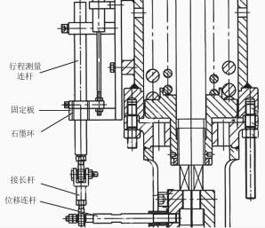 (1)為避免固定板與行程測(cè)量連桿的金屬與金屬接觸,將固定板孔擴(kuò)大后,加入一個(gè)具有潤(rùn)滑效果的厚度為20mm的剛性石墨圓環(huán)。