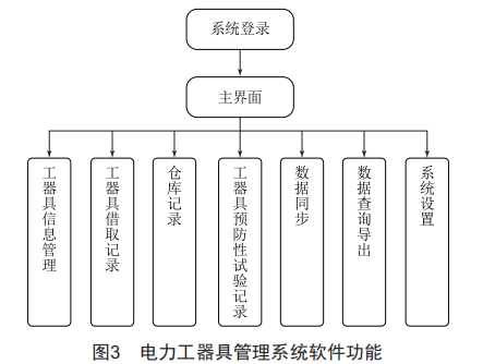 電力工器具管理系統(tǒng)有系統(tǒng)登錄、主界面、工器具信息、工器具借取記錄、倉(cāng)庫(kù)記錄、預(yù)防性試驗(yàn)記錄、數(shù)據(jù)同步、數(shù)據(jù)查詢(xún)導(dǎo)出、系統(tǒng)設(shè)置等功能。軟件功能如圖3所示